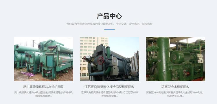 公司长期回收各种溴化锂机组、吸收式冷水机组、溴化锂冷水机组、热泵风冷机组、活塞式机组、二手螺杆机组、蒸汽溴化锂机组、溴化锂冷水机组、溴化锂冷热水机组、活塞式溴化锂机组、直燃式溴化锂机组(气体溴化锂机组、燃料溴化锂机组)、双燃料溴化锂机组、热水溴化锂机组、太阳能溴化锂机组等。